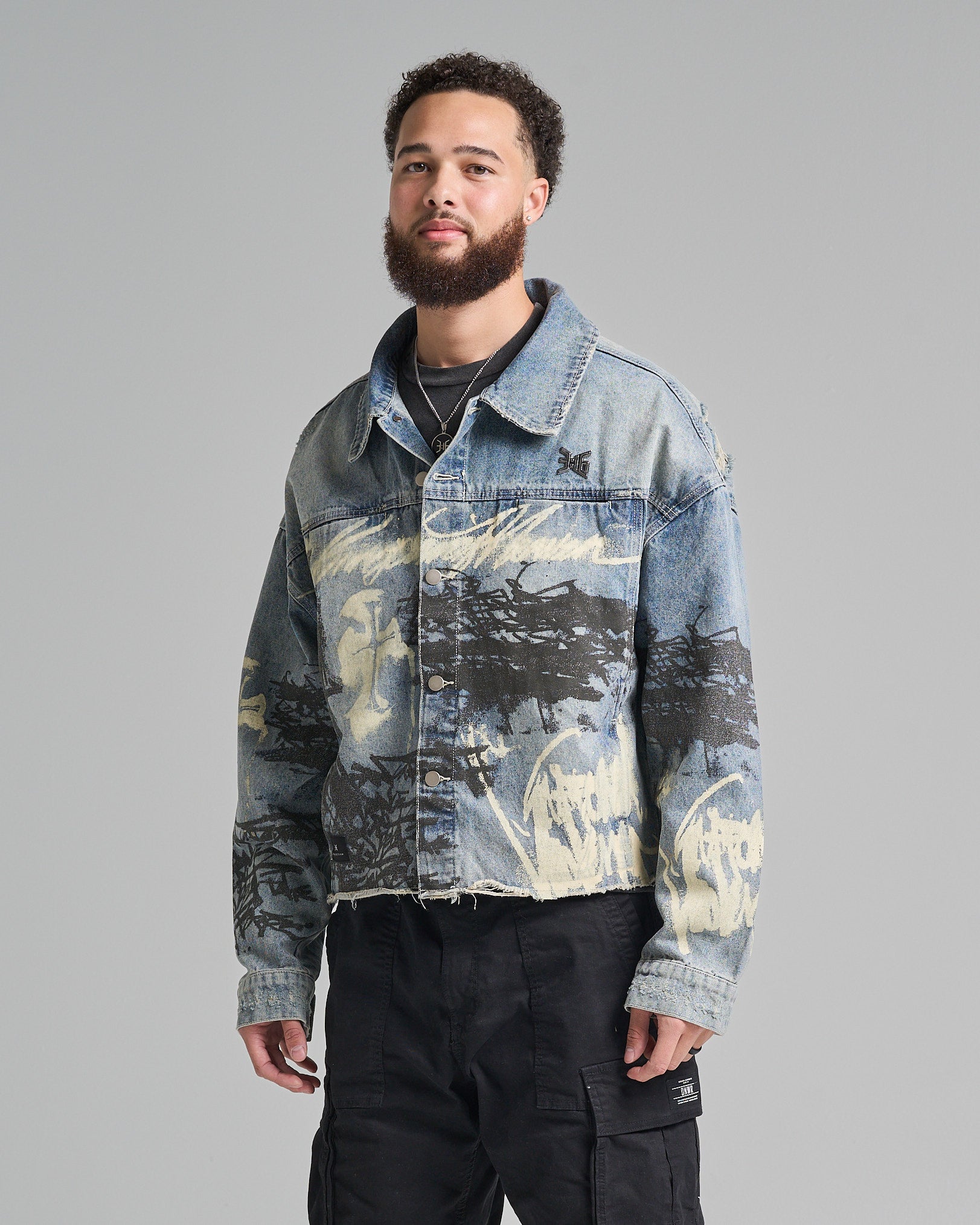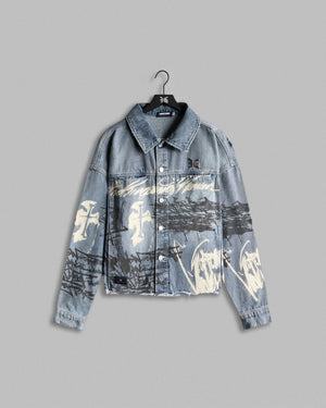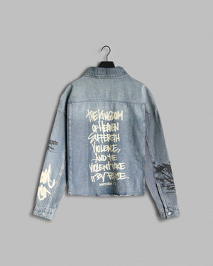The Kingdom Denim Jacket is a modern take on a classic outerwear staple. Featuring a cropped boxy fit and an abstract graphic inspired by Matthew 11:12. This jacket combines rugged detailing with refined craftsmanship to enhance its versatility and style. A must-have addition to your wardrobe, as it pairs seamlessly with the Kingdom Denim Pant and other pieces in this collection.